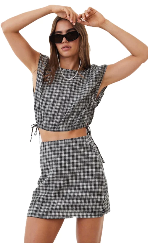 This cropped tie top makes any lady feel femme. The material is crafted from lightweight hemp and tencel check seersucker. The Style is a cropped silhouette with capped sleeves and side ties to cinch the waist to your liking. You can pair it with the matching skirt to go from day to night with ease.