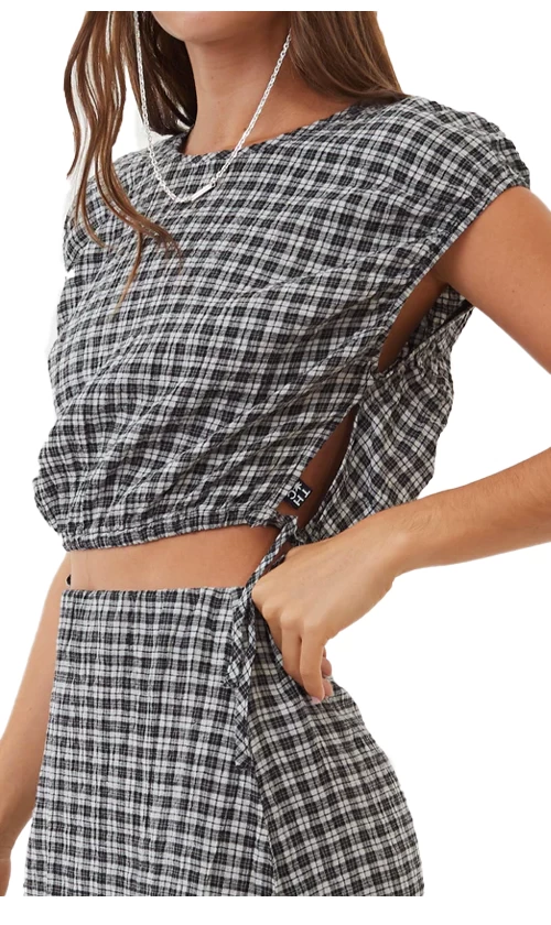 Afends Asta Seeksucker Check Hemp Ladies Tie Top Steel