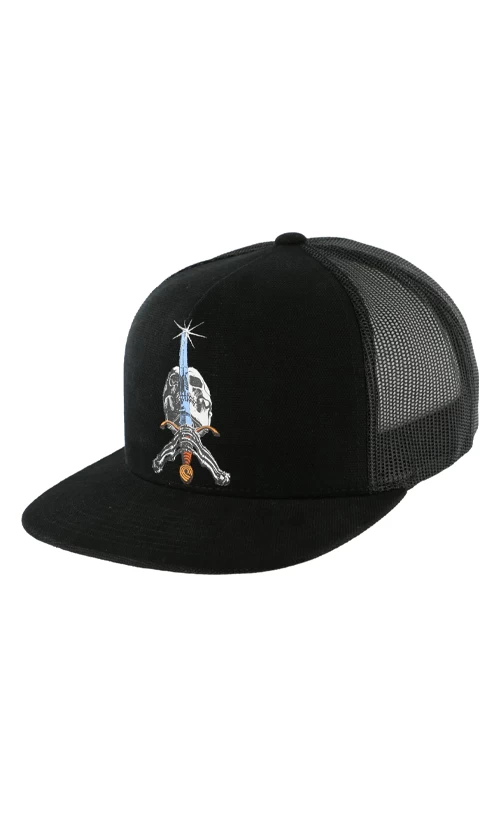 - Classic Flex Fit Trucker in black canvas with screen printed Skull and Sword artwork on front.